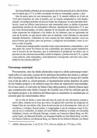 Precisamente, ante las dudas planteadas respecto a dicho patronazgo muni- cipal sobre el convento, a pesar de los informes favorables del síndico y subsín- dico ilicitanos, se decidió elevar consulta al Real y Supremo Consejo de Castilla con el fin de saber si, efectivamente, el Ayuntamiento podía disponer de parte de los fondos propios y de arbitrios para las obras de reparación mencionadas. En el mes junio, el convento de Santa Clara daba poderes a Simón Gómez para que compareciera ante dicho Consejo de Castilla con el fin de solicitar que de los fondos propios y de arbitrios del Municipio se suministre la cantidad que se acuerde para las mencionadas obras: