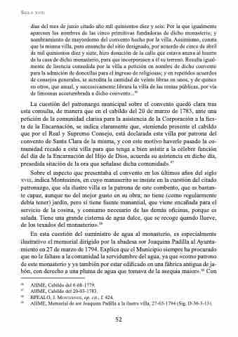 La cuestión del patronazgo municipal sobre el convento quedó clara tras esta consulta, de manera que en el cabildo del 20 de marzo de 1783, ante una petición de la comunidad clarisa para la asistencia de la Corporación a la fies- ta de la Encarnación, se indica claramente que, «teniendo presente el cabildo que por el Real y Supremo Consejo, está declarada esta villa por patrona del convento de Santa Clara de la misma, y con este motivo haverle pasado la co- munidad recado a esta villa para que tenga a bien asistir a la célebre función del día de la Encarnación del Hijo de Dios, acuerda su asistencia en dicho día, presedida sitación de la ora que señalase dicha comunidad».87