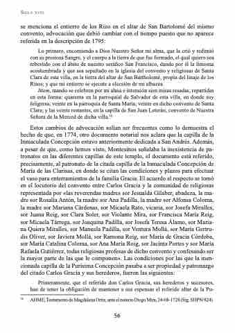 Estos cambios de advocación solían ser frecuentes como lo demuestra el hecho de que, en 1774, otro documento notarial nos aclara que la capilla de la Inmaculada Concepción estuvo anteriormente dedicada a San Andrés. Además, a pesar de que, como hemos visto, Montesinos señalaba la inexistencia de pa- tronatos en las diferentes capillas de este templo, el documento está referido, precisamente, al patronato de la citada capilla de la Inmaculada Concepción de María de las Clarisas, en donde se citan las condiciones y plazos para efectuar el vaso para enterramientos de la familia Gracia. El acuerdo al respecto se tomó en el locutorio del convento entre Carlos Gracia y la comunidad de religiosas representada por «las reverendas madres sor Jesualda Gilaber, abadeza, la ma- dre sor Rosalía Antón, la madre sor Ana Padilla, la madre sor Alfonsa Coloma, la madre sor Mariana Cárdenas, sor Micaela Rato, vicaria, sor Josefa Miralles, sor Juana Reig, sor Clara Soler, sor Violante Mira, sor Francisca María Reig, sor Micaela Tárrega, sor Joaquina Padilla, sor Josefa Teresa Álamo, sor Maria- na Quiera Miralles, sor Manuela Padilla, sor Ventura Mollá, sor María Gertru- dis Oliver, sor Javiera Mollá, sor Ramona Reig, sor María de Gracia Córdoba, sor María Catalina Coloma, sor Ana María Roig, sor Jacinta Portes y sor María Rafaela Gutiérrez, todas religiosas profesas de dicho convento y confesando ser la mayor parte de las que le componen». Las condiciones por las que la men- cionada capilla de la Purísima Concepción pasaba a ser propiedad y patronazgo del citado Carlos Gracia y sus herederos, fueron las siguientes: