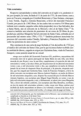 Respecto a propiedades y rentas del convento en el siglo xvIII, podemos ci- tar, por ejemplo, la venta, fechada el 11 de junio de 1711, de unas tierras, casa y pozo en Viscarra, otorgada por Cristóbal Benavente y Clara Soriano, cónyuges, y José, Tomás, Ángela y Antonia Benavente, a favor del mercader Francisco Cossén, por precio de 1.842 libras, de las cuales éste se reserva 514 libras para redimir siete censales cargados sobre dicha propiedad, tres a San Salvador, dos a Santa María, uno al convento de la Merced y otro al de Santa Clara.101 Se conserva también una relación de pensiones de un censo de 50 libras de pro- piedad que satisface Margarita Tarí al convento de Santa Clara, cobradas por el procurador del mismo entre 1708 y 1721.102 También podemos mencionar los procesos del convento contra Claudio, Salvador y Francisca Perpiñán en 1712 sobre las pensiones de unos censos.103