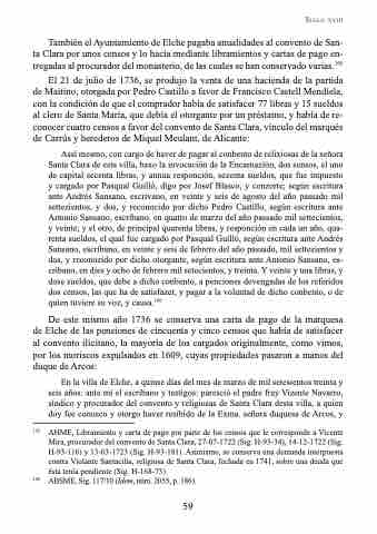 De este mismo año 1736 se conserva una carta de pago de la marquesa de Elche de las pensiones de cincuenta y cinco censos que había de satisfacer al convento ilicitano, la mayoría de los cargados originalmente, como vimos, por los moriscos expulsados en 1609, cuyas propiedades pasaron a manos del duque de Arcos: