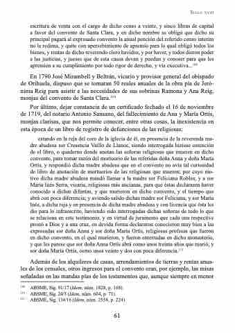 estando en la reja del coro de la iglecia de él, en presencia de la reverenda ma- dre abadesa sor Cresencia Vaillo de Llanos, siendo interrogada hiziese ostención de el libro, o quaderno donde anotan las señoras religiosas que mueren en dicho convento, para tomar razón del mortuorio de las referidas doña Anna y doña María Ortís, y respondió dicha madre abadesa que en el convento no avía tal curiosidad de libro de anotación de mortuorios de las religiosas que mueren; por cuyo mo- tivo dicha madre abadesa mandó llamar a la madre sor Feliciana Robles, y a sor Maria Inés Serra, vicaria, religiosas más ancianas, para que éstas declarasen haver conocido a dichas difuntas, y que murieron en dicho convento, y el tiempo que abrá con poca diferencia; y aviendo salido dichas madre sor Feliciana, y sor María Inés, a dicha reja y en presencia de dicha madre abadesa y con licencia que ésta les dio para lo infraescrito, haviendo sido interrogadas dichas señoras de todo lo que se relaciona en este testimonio, y en virtud de juramento que cada una respective prestó a Dios y a una cruz, en devida forma declararon conocieron muy bien a las expresadas sor doña Anna y sor doña María Ortís, religiosas profesas que fueron en dicho convento, en el qual murieron, y fueron enterradas en dicho monasterio, y que les parese que sor doña Anna Ortís abrá como unos treinta años que murió; y sor doña María Ortís, como unos veinte y dos con poca diferencia.111