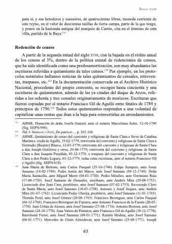 A partir de la segunda mitad del siglo xvIII, con la bajada en el rédito anual de los censos al 3%, dentro de la política estatal de redenciones de censos, que ha sido identificada como una predesamortización, son muy abundantes las escrituras referidas a quitamiento de tales censos.114 Por ejemplo, en los proto- colos notariales hallamos noticias de tales quitamientos de censales, retroven- tas, traspasos, etc.115 En la documentación conservada en el Archivo Histórico Nacional, procedente del propio convento, se recogen hasta cincuenta y una escrituras de quitamientos, además de las ya citadas del duque de Arcos, refe- ridas a los ochenta y tres censales originariamente de moriscos. Escrituras que fueron copiadas por el notario Francisco Gil de Agulló entre finales de 1789 y principios de 1790.116 Todos estos quitamientos responden a una voluntad de capitalizar unas rentas que iban a la baja para reinvertirlas en arrendamientos.