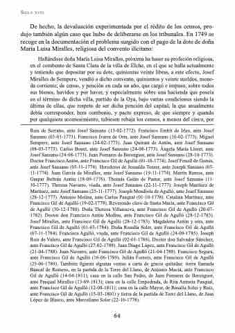 Hallándose doña María Luisa Miralles, próxima ha haser su profeción religiosa, en el combento de Santa Clara de la villa de Elche, en el que se halla actualmente y teniendo que depositar por su dote, quinientas veinte libras, a este efecto, Josef Miralles de Sempere, vendió a dicho convento, quinientos y veinte sueldos, mone- da corriente, de censo, y pención en cada un año, que cargó e impuso, sobre todos sus bienes, havidos y por haver, y especialmente sobre una hacienda que poseía en el término de dicha villa, partido de la Oya, bajo varias condiciones siendo la última de ellas, que respeto de ser dicha pención del capital, la que anualmente debía corresponder, hera combenio, y pacto expreso, de que siempre y quando por qualquiera acontesimiento, tubiesen rebaja los censos, a menos del cinco, por