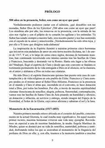 La inspiración de tu Espíritu iluminó a nuestras primeras cinco hermanas que iniciaron esta andadura de amor en esta tierra nuestra ilicitana, un 1 de ene- ro de 1517. Y así, a lo largo de estos cinco siglos, decenas de hermanas nues- tras, han continuado recorriendo este mismo camino tras las huellas de Clara y Francisco, buscando y deseando ver tu Rostro. Hasta este lugar a las riberas del Vinalopó, llegó el espíritu de Clara y desde que este convento se fundara es testimonio permanente de la vida entregada a Dios en el silencio, en la clausura, en el amor y alabanza a Dios en todas sus criaturas.