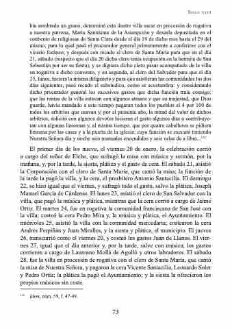 bía sembrado un grano, determinó esta ilustre villa sacar en procesión de rogativa a nuestra patrona, María Santísima de la Asumpción y dexarla depositada en el conbento de religiosas de Santa Clara desde el día 19 de dicho mes hasta el 29 del mismo; para lo qual pasó el procurador general primeramente a conferirse con el vicario foráneo, y después con recado al clero de Santa María para que en el día 21, sábado (respecto que el día 20 dicho clero tenía ocupación en la hermita de San Sebastián por ser su fiesta), y se dignara dicho clero pasar acompañado de la villa en rogativa a dicho convento, y en segunda, al clero del Salvador para que el día 23, lunes, hiciera la misma diligencia y para que asistieran las comunidades los dos días siguientes, pasó recado el subsíndico, como se acostumbra: y considerando dicho procurador general los excesivos gastos que dicha función traía consigo; que las rentas de la villa estavan con algunos atrasos y que su majestad, que Dios guarde, havía mandado a este tiempo pagaran todos los pueblos el 4 por 100 de todos los arbitrios que usavan y, por el presente año, la mitad del valor de dichos arbitrios, solicitó con algunos devotos hicieran el gasto algunos días o contribuye- ran con algunas limosnas y, al mismo tiempo, que por quatro caballeros se pidiera limosna por las casas y a la puerta de la iglesia: cuya función se executó teniendo Nuestra Señora día y noche seis manuales encendidos y seis velas de a libra...132