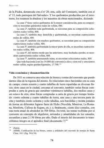 De 1811 se conserva una relación de bienes y rentas del convento que puede darnos idea de la riqueza del mismo. Se relacionan cinco haciendas con su casa de campo; ciento sesenta y cuatro tahúllas de tierra repartidas en diversas fin- cas; siete casas en la ciudad, cercanas al convento; también varias fincas com- pradas a carta de gracia que sumaban veintinueve tahúllas, dos medias casas y un octavo de otra; otras fincas compradas a carta de gracia por tiempo limita- do: ciento ochenta y cuatro tahúllas de tierra, una casa y una tercera parte de otra y también ciento ochenta y ocho tahúllas, seis barchillas y treinta jornales de tierras en diferentes lugares fuera de Elche (Novelda, Monóvar, La Roma- na, Monforte, Callosa de Segura, etc.); y, finalmente, ciento diez censales, con una renta anual de alrededor de 500 libras. En total, las rentas recibidas por el convento en concepto de alquileres, arriendos y anualidades de los censales, ascendían a unas 2.130 libras por año. Dado el interés del documento lo trans- cribimos íntegro en el apéndice final (documento 7)140