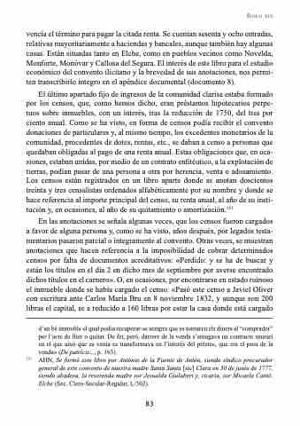 vencía el término para pagar la citada renta. Se cuentan sesenta y ocho entradas, relativas mayoritariamente a haciendas y bancales, aunque también hay algunas casas. Están situadas tanto en Elche, como en pueblos vecinos como Novelda, Monforte, Monóvar y Callosa del Segura. El interés de este libro para el estudio económico del convento ilicitano y la brevedad de sus anotaciones, nos permi- ten transcribirlo íntegro en el apéndice documental (documento 8).