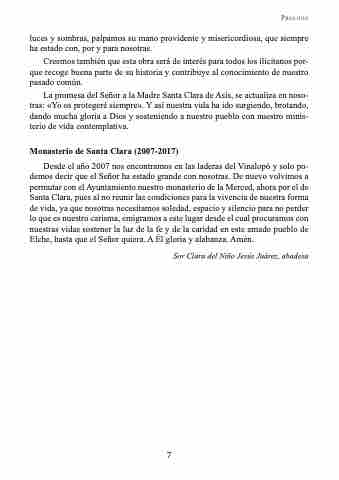 Desde el año 2007 nos encontramos en las laderas del Vinalopó y solo po- demos decir que el Señor ha estado grande con nosotras. De nuevo volvimos a permutar con el Ayuntamiento nuestro monasterio de la Merced, ahora por el de Santa Clara, pues al no reunir las condiciones para la vivencia de nuestra forma de vida, ya que nosotras necesitamos soledad, espacio y silencio para no perder lo que es nuestro carisma, emigramos a este lugar desde el cual procuramos con nuestras vidas sostener la luz de la fe y de la caridad en este amado pueblo de Elche, hasta que el Señor quiera. A Él gloria y alabanza. Amén.