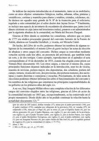 De hecho, del Libro de recibo, podemos obtener los nombres de algunas re- ligiosas de la comunidad y el mismo Libro de gasto incluye las actas de elección de abadesa y otros cargos del convento. Dichos cargos se renovaban mediante votación secreta cada tres años, en presencia del provincial, que también tenía un voto, y de dos testigos. Como ejemplo, reproducimos en el apéndice el acta correspondiente al 10 de diciembre de 1833, cuando fue elegida como priora sor Ventura Rizo (documento 10). Los otros cargos, a renovar el mismo día, cuyas principales funciones dejamos indicadas en la introducción, eran los de vicaria, maestra de novicias, portera mayor, dos depositarias, dos celadoras, portera del campo, tornera, vicaria del coro, dos provisoras, dos porteras menores, dos sacris- tanas y cuatro discretas o consejeras y escuchas. Precisamente, de tales actas de elecciones podemos obtener información sobre el funcionamiento del convento y los nombres de las religiosas que ostentaron las principales responsabilidades de su gobierno en los primeros años del siglo xIx.