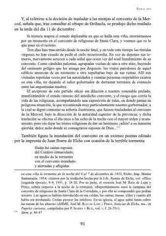 en esta villa la tormenta de la noche del 6 al 7 de diciembre de 1853, Elche, Imp. Matías Santamaría, 1854; citamos por la reedición hecha por la Lib. Atenea de Elche, col. «Illice (segunda época)», 8-9, 1951, p. 18-20. Por su parte, el cronista José M. Ruiz de Lope y Pérez, señala respecto a la noche de la tormenta: «Repentinamente sonó la campana del convento de religiosas de Santa Clara de la Corredera, y por ella se comprendió que pedían socorro. Las aguas se habían introducido en sus celdas, las camas, mesas, sillas y cuanto allí había era arrebatado. Creían perecer las infelices. En su iglesia, el agua subió hasta cubrir las mesas de los altares» (AHME, José M. RuIz de lope y péRez, Noticias de Elche, ms., en Papeles curiosos, compilados por P. IBaRRa y RuIz, vol. v, f. 26-35v).