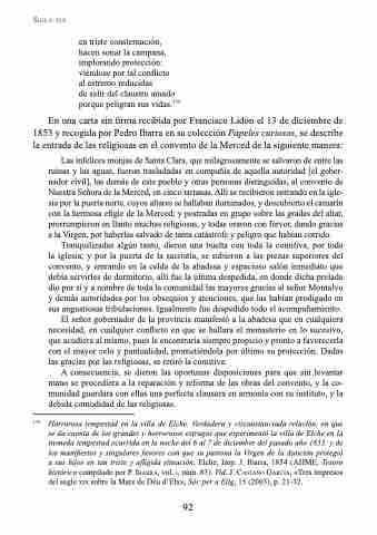 Las infelices monjas de Santa Clara, que milagrosamente se salvaron de entre las ruinas y las aguas, fueron trasladadas en compañía de aquella autoridad [el gober- nador civil], las demás de este pueblo y otras personas distinguidas, al convento de Nuestra Señora de la Merced, en cinco tartanas. Allí se recibieron entrando en la igle- sia por la puerta norte, cuyos altares se hallaban iluminados, y descubierto el camarín con la hermosa efigie de la Merced; y postradas en grupo sobre las gradas del altar, prorrumpieron en llanto muchas religiosas, y todas oraron con fervor, dando gracias a la Virgen, por haberlas salvado de tanta catástrofe y peligro que habían corrido.