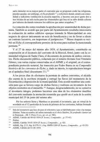 Y el 27 de mayo del mismo año 1854, el Ayuntamiento, constituido en corporación en el locutorio del convento de la Merced, firmó, junto con la co- munidad religiosa de Santa Clara, el documento de permuta de ambos conven- tos. Dicho documento público, redactado por el notario ilicitano José Trinitario Gómez, con varias copias conservadas en el AHME y el original, en el corres- pondiente protocolo notarial, fue transcrito por Pedro Ibarra en su Compendio histórico de los conventos de Elche, y, dado su interés, lo reproducimos íntegro en el apéndice final (documento 11).181