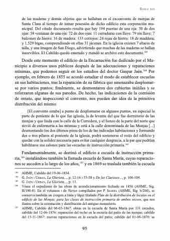 Desde este momento el edificio de la Encarnación fue dedicado por el Mu- nicipio a diversos usos públicos después de las adecuaciones y reparaciones mínimas, que podemos seguir en los estudios del doctor Gaspar Jaén.184 Por ejemplo, en febrero de 1855 se acordó estudiar el modo de establecer escuelas en sus habitaciones, tras la reparación de su fábrica que amenazaba desplomar- se por varios puntos; finalmente, se desmontaron dos cubiertas inútiles y se reforzaron algunas de sus paredes. De hecho, las indicaciones de la comisión de ornato, que inspeccionó el convento, nos pueden dar idea de la primitiva distribución del mismo: