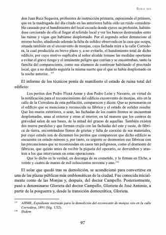 don Juan Ruiz Sequeira, profesores de instrucción primaria, esponiendo el primero, que en la madrugada del día citado en las anteriores había oído un ruido considera- ble causado por el hundimiento del local escuela donde ejerce su profesión, habién- dose cerciorado de ello al llegar al referido local y ver los bancos destrozados entre las ruinas y vigas que habíanse desplomado. Por el segundo señor denunciose el mismo hecho, añadiendo además la falta de solidez observada en la casa que ocupa, situada también en el exconvento de monjas, cuya fachada mira a la calle Correde- ra, la cual produciría en breve plazo y, a no evitarlo, el hundimiento total de dicho edificio, por cuyo motivo suplicaba al señor alcalde tomase las medidas oportunas a evitar el grave riesgo y el inminente peligro que corrían y se encontraban, tanto la familia del compareciente, como sus alumnos de continuar habitando el precitado local, que a no dudarlo seguiría la misma suerte que el que se había desplomado en la noche anterior...197