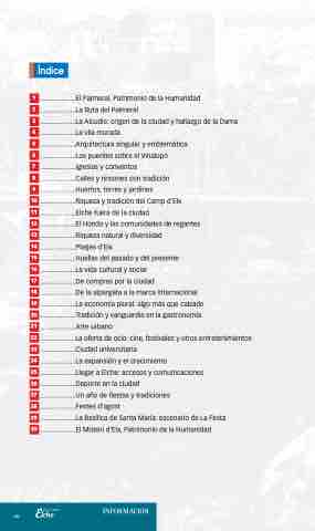 ...................Calles y rincones con tradición ...................Huertos, torres y jardines ...................Riqueza y tradición del Camp d'Elx ...................Elche fuera de la ciudad