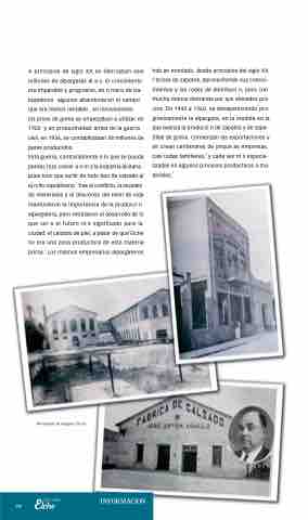 hab an montado, desde principios del siglo XX, f bricas de zapatos, aprovechando sus conoci- mientos y las redes de distribuci n, pero con mucha menos demanda por sus elevados pre- cios. De 1940 a 1960, va desapareciendo pro- gresivamente la alpargata, en la medida en la que avanza la producci n de zapatos y de zapa- tillas de goma. Comienzan las exportaciones y se crean centenares de peque as empresas, casi todas familiares,˚ y cada vez m s especia- lizadas en algunos procesos productivos o ma- teriales.˚