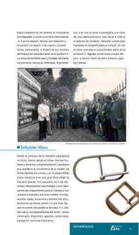 Desde el principio de la industria alpargatera en Elche, fueron desarroll ndose muchos tra- bajos y servicios complementarios o auxiliares que ayudaron al crecimiento de la ciudad. De forma paralela ha crecido y se ha desarrollado hasta nuestros d as una gran˚diversidad de industria auxiliar. Por una parte, est n las em- presas directamente relacionadas como fabri- cantes de componentes para el calzado y ma- quinaria (materiales sint ticos, textiles, hormas, tacones, suelas, accesorios y adornos met licos, productos qu micos, pieles ); y por otra, las que no siendo tan grande la vinculaci n, s que han sido y son dependientes del sector: cintas, cartonajes, imprentas, agentes comerciales, transporte, servicios financieros