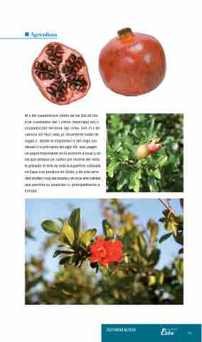 M s del cuarenta por ciento de los 326 kil me- tros cuadrados del t rmino municipal est n ocupados˚por terrenos agr colas. Son m s de catorce mil hect reas, pr cticamente todas de regad o desde la implantaci n del riego por elevaci n a principios del siglo XX que juegan un papel importante en la econom a local y en las que destaca un cultivo por encima del resto: la granada. El 40% de toda la superficie cultivada en Espa a se produce en Elche, y de una varie- dad (mollar) muy apreciada y de muy alta calidad que permite su exportaci n, principalmente a Europa.˚