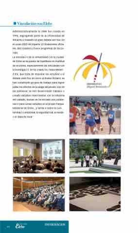 La vinculaci n de la Universidad con la ciudad de Elche se ha puesto de manifiesto en multitud de acciones, especialmente las vinculadas con la investigaci n. Se ha creado la c tedra Misteri d Elx, que trata de impulsar los estudios y el debate cient fico en torno al drama ilicitano; se han constituido grupos de trabajo para lograr paliar los efectos de la plaga del picudo rojo en las palmeras; se han desarrollado trabajos o creado estudios relacionados con la industria del calzado, incluso se ha iniciado una colabo- raci n para cursar estudios en el propio Parque Industrial de Elche , y tambi n sobre la con- taminaci n ambiental, la seguridad vial, el Hondo o el deporte local.˚