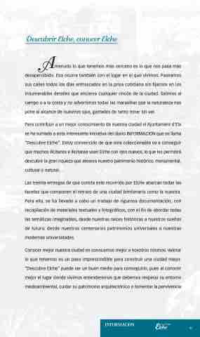 Para contribuir a un mejor conocimiento de nuestra ciudad el Ajuntament d’Elx se ha sumado a esta interesante iniciativa del diario INFORMACION que se llama “Descubre Elche”. Estoy convencido de que este coleccionable va a conseguir que muchos ilicitanos e ilicitanas vean Elche con ojos nuevos, lo que les permitirá descubrir la gran riqueza que atesora nuestro patrimonio histórico, monumental, cultural o natural...