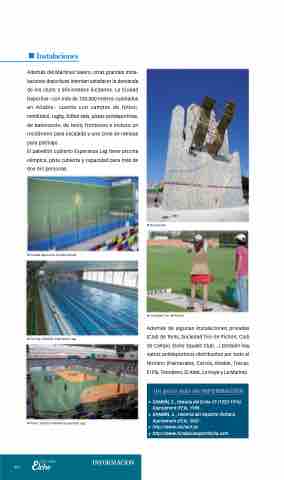 Además del Martínez Valero, otras grandes insta- laciones deportivas intentan satisfacer la demanda de los clubs y aficionados ilicitanos. La Ciudad Deportiva –con más de 150.000 metros cuadrados en Altabix– cuenta con campos de fútbol, minifútbol, rugby, fútbol sala, pistas polideportivas, de baloncesto, de tenis, frontones e incluso un rocódromo para escalada y una zona de rampas para patinaje.