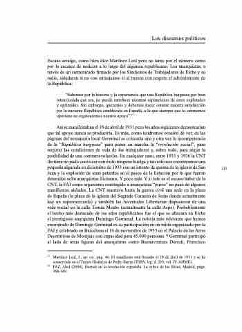 Escaso arraigo, como bien dice Martínez Leal pero no tanto por el número como por la escasez de noticias a lo largo del régimen republicano. Los anarquistas, a través de un comunicado firmado por los Sindicatos de Trabajadores de Elche y su radio, saludaron si no con entusiasmo sí al menos con respeto el advenimiento de la República: