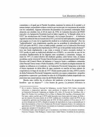 comunistas o, al igual que el Partido Socialista, mantener la retórica de la unidad y, al mismo tiempo, un profundo rechazo a todo lo que tuviera que ver con ponerse de acuerdo con los comunistas. Algunas referencias documentales nos permiten contemplar dicha situación con claridad. Así, el 28 de enero de 1938, la Comisión Ejecutiva del PSOE reprochó a la Agrupación Socialista local no haber seguido en “el llamado pleito de la UGT” las orientaciones del Comité Nacional y de la propia Ejecutiva “...si hubieseis seguido la actitud de ésta en el asunto de la UGT, y no la de los indisciplinados, seguramente esas pugnas en el seno de la organización sindical no se hubieran producido”. Pero los “indisciplinados” eran simplemente aquellos que no aceptaban la subordinación de la UGT por parte del PCE, como se había podido constatar con la Federación Provincial Campesina, una organización impulsada por el PCE que en las partidas rurales ilicitanas254 tuvo una fuerte implantación y que venía a resumir el nuevo escenario sindical: la UGT perdía en parte su tradicional afinidad con el PSOE y se convertía en uno de los escenarios fundamentales de las disputas entre socialistas y comunistas. Aunque, en enero de 1937, el control efectivo del sindicato quedara, como hemos visto, en manos socialistas con la victoria de Vicente García Serrano como secretario general del Consejo Ejecutivo del Control Obrero de Industria y Comercio frente a candidatos comunistas como Pascual Torres Aznar o Pedro Escalante, el PCE no dejaría en ningún momento de ampliar su influencia en el sindicato y la Federación Provincial Campesina es sin duda el mejor exponente de dicha labor de zapa, poniendo en marcha un buen número de cooperativas a lo largo de ese año de 1937. Desde nuestro punto de vista, el PCE a través de dicha Federación Provincial Campesina convirtió a su causa a campesinos –pequeños propietarios o aparceros- que durante los años de la II República habían simpatizado con posiciones tan conservadoras como las del Partido Radical.