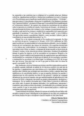civil. Procedimiento que se manifiesta cuando habla de iniciar un debate –“civilizado”– para que avance el conocimiento, de precisar el significado y las distintas acepciones de la “memoria histórica”, de situar en el lugar que le corresponde historiográficamente al “revisionismo histórico”, de exponer con valentía las conclusiones de sus análisis sobre la represión en su ámbito de estudio, la provincia de Alicante, y de defender su ética profesional al referirse a las víctimas y a los verdugos: reconocimiento explícito de todas y cada una de las víctimas y estudio de los responsables de la represión, pero guardando el anonimato. Y esto como fruto “del sentido común” y con el objetivo “de aprovechar nuestro conocimiento histórico como necesario refuerzo para la consolidación de una sociedad democrática” (p. 31).