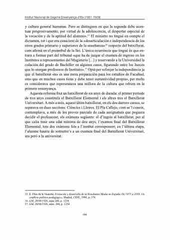 y cultura general humanas. Pero se distinguen en que la segunda debe acen- tuar progresivamente, por virtud de la adolescencia, el despertar especial de la vocación y de la aptitud del alumno».15 El ministre no tingué en compte el dictamen, tot i que era conscient de la «desarticulación e independencia de los otros grados primario y superiores de la enseñanza»16 respecte del batxillerat, com afirmà en el preàmbul de la llei. L’única ocurrència que tingué és que en- trara a formar part del tribunal «que ha de juzgar el examen de ingreso en los Institutos a representantes del Magisterio [...] y reservando a la Universidad la colación del grado de Bachiller en algunos casos, figurando entre los Jueces que lo otorgan profesores de Instituto».17 Optà per reforçar la independència ja que el batxillerat «no es una mera preparación para los estudios de Facultad, sino que en muchos casos tiene y debe tener sustantividad propia», per molts es considerava que representava una millora de la cultura que rebien en la primera ensenyança.