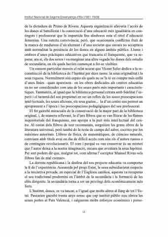 Un esment particular mereix el relat acurat que Vicent Soler dedica a la re- construcció de la biblioteca de l’Institut per dues raons: la seua originalitat i la seua riquesa. Normalment són espais als quals no se’ls té en compte més enllà d’unes línies –quan apareixen– en les obres dedicades als centres educatius en no ser considerades com una de les seues parts més importants i caracterís- tiques. Tanmateix, al igual que la biblioteca personal retrata amb fidelitat l’es- perit i el tarannà del seu propietari en ser un reflex de les seues preocupacions intel·lectuals, les seues aficions, els seus gustos... la d’un centre ens permet un apropament a l’època i les preocupacions pedagògiques del seu professorat.