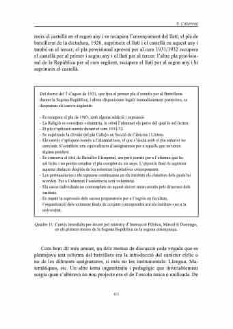 meix el castellà en el segon any i es recupera l’ensenyament del llatí; el pla de batxillerat de la dictadura, 1926, suprimeix el llatí i el castellà en aquest any i també en el tercer; el pla provisional aprovat per al curs 1931/1932 recupera el castellà per al primer i segon any i el llatí per al tercer; l’altre pla provisio- nal de la República per al curs següent, recupera el llatí per al segon any i hi suprimeix el castellà.