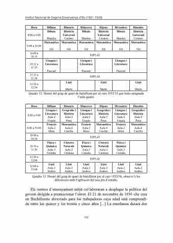 Quadre 13. Horari del grup de quart de batxillerat per al curs 1935/36, observe’s les diferències amb l’aplicació del nou pla d’estudis.