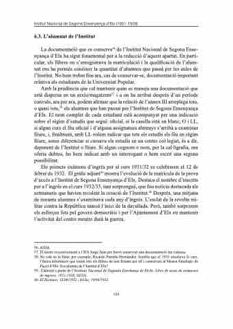 La documentació que es conserva56 de l’Institut Nacional de Segona Ense- nyança d’Elx ha sigut fonamental per a la redacció d’aquest apartat. En parti- cular, els llibres on s’enregistrava la matriculació i la qualificació de l’alum- nat ens ha permés conéixer la quantitat d’alumnes que passà per les aules de l’Institut. No hem trobat fins ara, cas de conservar-se, documentació important relativa als estudiants de la Universitat Popular.