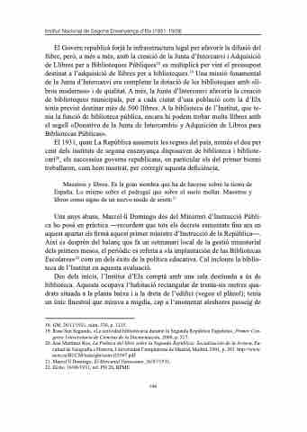 Uns anys abans, Marcel·lí Domingo des del Ministeri d’Instrucció Públi- ca ho posà en pràctica ―recordem que tots els decrets esmentats fins ara en aquest apartat els firmà aquest primer ministre d’Instrucció de la República―. Així es desprén del balanç que fa un setmanari local de la gestió ministerial dels primers mesos, el periòdic es referia a «la implantación de las Bibliotecas Escolares»22 com un dels èxits de la política educativa. Cal incloure la biblio- teca de l’Institut en aquesta avaluació.