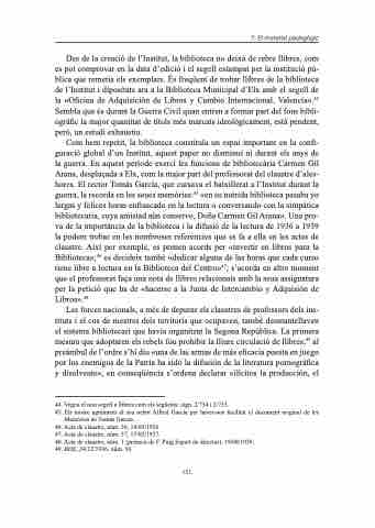 Com hem repetit, la biblioteca constituïa un espai important en la confi- guració global d’un Institut, aquest paper no disminuí ni durant els anys de la guerra. En aquest període exercí les funcions de bibliotecària Carmen Gil Arana, desplaçada a Elx, com la major part del professorat del claustre d’ales- hores. El rector Tomás García, que cursava el batxillerat a l’Institut durant la guerra, la recorda en les seues memòries:45 «en su nutrida biblioteca pasaba yo largas y felices horas enfrascado en la lectura o conversando con la simpática bibliotecaria, cuya amistad aún conservo, Doña Carmen Gil Arana». Una pro- va de la importància de la biblioteca i la difusió de la lectura de 1936 a 1939 la podem trobar en les nombroses referències que es fa a ella en les actes de claustre. Així per exemple, es prenen acords per «invertir en libros para la Biblioteca»;46 es decideix també «dedicar alguna de las horas que cada curso tiene libre a lectura en la Biblioteca del Centro»47; s’acorda en altre moment que el professorat faça una nota de llibres relacionats amb la seua assignatura per la petició que ha de «hacerse a la Junta de Intercambio y Adquisión de Libros».48