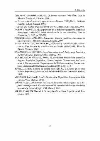 ― Elche, una ciudad en guerra (1936-1939), Llibreria Ali i Truc, Elx, 2008. PABLO, CARLOS DE, «La depuración de la Educación española durante el franquismo (1936-1975). Institucionalización de una represión», Foro de