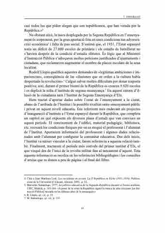 Hem tractat d’aportar dades sobre l’estat de l’ensenyament a la ciutat, abans de l’arribada de l’Institut i la possible rivalitat entre ensenyament públic i privat en aquest nivell educatiu. Ens referirem més endavant als projectes d’inauguració d’instituts a l’Estat espanyol durant la República, que completa un capítol en què exposem els diversos plans d’estudi que van conviure en aquest període. El coneixement de l’edifici, material pedagògic, biblioteca, etc. recrearà les condicions físiques per on es mogué el professorat i l’alumnat de l’Institut. Aportarem informació del professorat i algunes dades relacio- nades amb l’alumnat per configurar la comunitat educativa. Des dels inicis, l’Institut va nàixer vinculat a la ciutat; farem referència a aquesta relació tam- bé. Finalment, tractarem el període més convuls del primer institut d’Elx, el que visqué des de l’inici de la revolta militar fins al tancament d’aquest. Tota aquesta informació es recolza en les referències bibliogràfiques i les consultes d’arxius que es donen a peu de pàgina i al final del llibre.