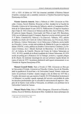 Vicente Genovés Amorós. Naix a València el 1909. Llicenciat en Filo- sofia i Lletres, Secció Història; llicenciat en Dret. Ajudant de la Facultat de Filosofia i Lletres de la Universitat de València, adscrit a l’assignatura d’His- tòria de la Cultura durant el curs 1932/32. Publicacions: El imperio hispánico bajo Felipe II, 1927; Estancia en Valencia del Rey Don José I,València, 1929; El valencià Jaume Rasquín. Governador del Plata al segle XVI, Barcelona, 1930, (en col·laboració amb P. Campos); Repertori provincial dels gravats del P. P. Moles, Castelló1932; Valencia y los franceses, València, 1931; articles científics en Anales del Centro de Cultura Valenciana, Las Provincias, Diario de Valencia, Cultura Valenciana i Acció Valenciana a València; escriu també en Filosofía y Letras, revista universitària de Madrid de la que és codirector durant 1929/30; a més, publica en Estudios Universitarios Catalanes, La Pa- raula Cristiana, Azor i Mundo Ilustrado de Barcelona i en el Boletín de la S.C. de Cultura, de Castelló. Director del Centro de Cultura Valenciana en 1932. El 1935, medalla de la Reial Acadèmia de Cultura Valenciana. El 1939 escriu un pròleg per a Romances de la Falange: primero y segundo pliegos de R. Duyos. És nomenat encarregat de curs per primera vegada durant els cursos d’estiu de 1933 i la primera destinació amb aquest nomenament va ser l’Institut de Segona Ensenyança d’Elx.