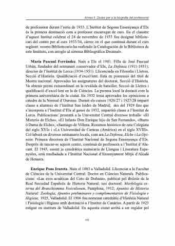 de professorat durant l’estiu de 1933. L’Institut de Segona Ensenyança d’Elx és la primera destinació com a professor encarregat de curs. En el claustre d’aquest Institut celebrat el 24 de novembre de 1933 fou designat bibliote- cari del centre per al curs 1933/34, càrrec en el que continuà durant el curs següent: «como Bibliotecario ha realizado la Catalogación de la Biblioteca de este Instituto, con arreglo al sistema Bibliográfica Decimal».