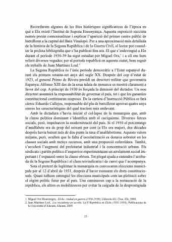Recordarem algunes de les fites històriques significatives de l’època en què a Elx existí l’Institut de Segona Ensenyança. Aquesta exposició succinta només pretén contextualitzar i explicar l’aparició del primer centre públic de batxillerat a la capital del Baix Vinalopó. Per a una aproximació més detallada de la història de la Segona República i de la Guerra Civil, el lector pot consul- tar la prolixa bibliografia que s’ha publicat fins ara. El que s’esdevingué a Elx durant el període 1936-39 ha sigut estudiat per Miguel Ors,1 i a ell ens hem referit diverses vegades; per al període republicà en aquesta ciutat, hem seguit els treballs de Juan Martínez Leal.2