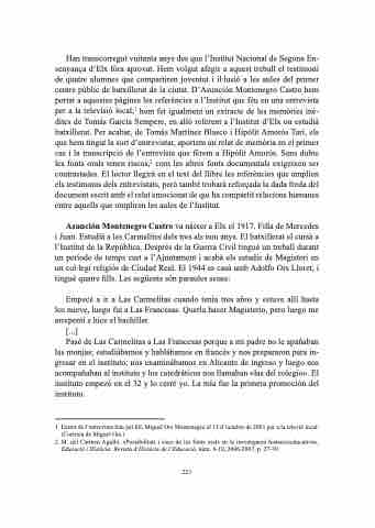 Han transcorregut vuitanta anys des que l’Institut Nacional de Segona En- senyança d’Elx fóra aprovat. Hem volgut afegir a aquest treball el testimoni de quatre alumnes que compartiren joventut i il·lusió a les aules del primer centre públic de batxillerat de la ciutat. D’Asunción Montenegro Castro hem portat a aquestes pàgines les referències a l’Institut que féu en una entrevista per a la televisió local;1 hem fet igualment un extracte de les memòries inè- dites de Tomás García Sempere, en allò referent a l’Institut d’Elx on estudià batxillerat. Per acabar, de Tomás Martínez Blasco i Hipòlit Amorós Tarí, els que hem tingut la sort d’entrevistar, aportem un relat de memòria en el primer cas i la transcripció de l’entrevista que férem a Hipòlit Amorós. Sens dubte les fonts orals tenen riscos,2 com les altres fonts documentals exigeixen ser contrastades. El lector llegirà en el text del llibre les referències que amplien els testimonis dels entrevistats, però també trobarà reforçada la dada freda del document escrit amb el relat emocionat de qui ha compartit relacions humanes entre aquells que ompliren les aules de l’Institut.