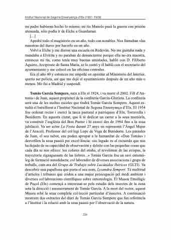 Tomás García Sempere, naix a Elx el 1924, i va morir el 2002. Fill d’An- tonia i de Juan, aquest propietari de la confiteria García-Glorieta. La confiteria serà una de les moltes escoles que tindrà Tomás García Sempere. Aquest es- tudià el batxillerat a l’Institut Nacional de Segona Ensenyança d’Elx. El 1954 fou ordenat rector i exercí la tasca pastoral a parròquies d’Elx, Torrevella i Benidorm. En aquesta ciutat, que li té dedicat un carrer a la seua memòria, va construir l’església del Bon Pastor i hi exercí des de 1964 fins a la seua jubilació. Va ser actor La Festa durant 27 anys on representà l’Àngel Major de l’Araceli. Professor del col·legi Lope de Vega de Benidorm. Les paraules de Juan, el seu nebot, ens poden apropar a la humanitat de «Don Tomás» i desvetllen la seua passió per excel·lència: «su legado es el recuerdo que nos ha dejado de su capacidad de observación y deleite con las pequeñas cosas que cada día se nos ofrece: los colores del otoño, el revolotear de las avispas, la trayectoria zigzagueante de las liebres...» Tomás García fou un savi entomò- leg de formació autodidacta; col·laborador de diverses associacions i grups de treballs, com ara del Grupo de Trabajo sobre Lucánidos Ibéricos (GLTI). Va descobrir una papallona que porta el seu nom, Lysandra Semperi. Té multitud d’articles i tribunes que criden a una major preocupació pel medi ambient i diverses col·laboracions científiques sobre entomologia. El Museu Etnològic de Puçol (Elx) començà a interessar-se pels estudis dels insectes de la zona sota la direcció i assessorament de Tomás García. A la mort del rector, aquest Museu rebé la seua completa col·lecció particular d’insectes. A continuació mostrem dos extractes del diari de Tomás García Sempere que fan referència a l’Institut i la relació amb la seua passió per l’observació de la natura.