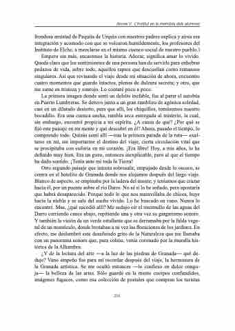 ¿Y de la lectura del arte ―a la luz de las piedras de Granada― qué de- duje? Vano empeño fue para mí recordar después del viaje, la hermosura de la Granada artística. Se me ocultó entonces ―lo confieso en dulce congo- ja― la belleza de las artes. Sólo guardé en la mente cuerpos confundidos, imágenes fugaces, como esa colección de postales que compran los turistas