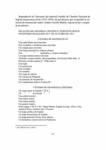 Reproducció de l’inventari del material científic de l’Institut Nacional de Segona Ensenyança d’Elx (1931-1939), fet pel director que va presidir la co- missió de clausura del centre, Andrés Carrillo Martín. Aquest revisa i comple- ta un anterior.