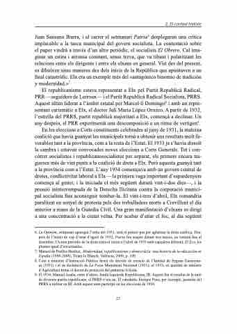 Juan Sansano Ibarra, i al carrer el setmanari Patria6 desplegaran una crítica implacable a la tasca municipal del govern socialista. La contestació sobre el paper vindrà a través d’un altre periòdic, el socialista El Obrero. Cal ima- ginar un estira i arronsa constant, sense treva, que va tibant i polaritzant les relacions entre els dirigents i entre els elxans en general. Vist des del present, es dibuixen unes maneres des dels inicis de la República que apuntaven a un final catastròfic. Elx era un exemple més del «antagónico binomio de tradición y modernidad.»7