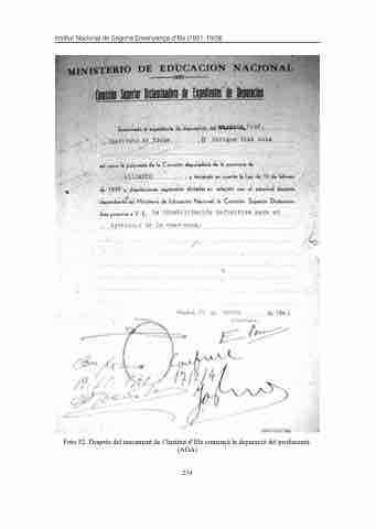 Institut Nacional de Segona Ensenyança d’Elx (1931-1939) Foto 32. Després del tancament de l’Institut d’Elx començà la depuració del professorat. (AGA) 274