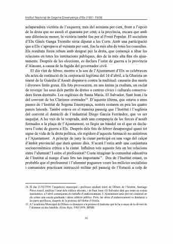 El dia vint de febrer, mentre a la seu de l’Ajuntament d’Elx se celebraven els actes de restitució de la corporació legítima del 14 d’abril, a la Glorieta un tinent de la Guàrdia d’Assalt disparava contra la multitud: causaria dos morts i diversos ferits greus. Els fets provocaren, en uns ànims ja exaltats, un esclat de revenja: les seus dels partits de dretes o centres cívics i culturals conserva- dors foren destruïts. Les esglésies de Santa Maria, El Salvador, Sant Joan i la del convent de les Clarisses cremades14. D’aquesta última, que estava a unes passes de l’Institut de Segona Ensenyança, només restaren en peu les quatre parets laterals. També estava en el mateixa passeig que l’Institut i l’església del convent el domicili de l’industrial Diego García Ferrández, que va ser saquejat. A les vuit de la vesprada, amb una companyia de les forces d’assalt formades a la plaça de l’Ajuntament, es llegia un bàndol en el que es decla- rava l’estat de guerra a Elx. Després dels fets de febrer desaparegué quasi tot signe de vida de la dreta política, els regidors d’aquesta formació no assistiren a l’Ajuntament. A principi de juny la ciutat participà en una vaga del calçat d’àmbit provincial que durà quinze dies. S’acarà l’estiu amb una conjuntura socioeconòmica crítica a la ciutat. Influïren tots aquests fets en les relacions entre l’alumnat? I entre el professorat? Costa imaginar la comunitat educativa de l’Institut al marge d’uns fets tan importants15. Des de l’Institut estant, es probable que el professorat i l’alumnat pogueren veure les milícies socialistes i comunistes practicant instrucció militar pel passeig de l’Estació a colp de