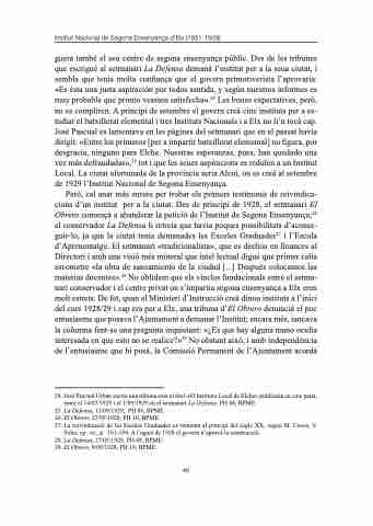 Però, cal anar més enrere per trobar els primers testimonis de reivindica- cions d’un institut per a la ciutat. Des de principi de 1928, el setmanari El Obrero començà a abanderar la petició de l’Institut de Segona Ensenyança;26 el conservador La Defensa li retreia que havia poques possibilitats d’aconse- guir-lo, ja que la ciutat tenia demanades les Escoles Graduades27 i l’Escola d’Aprenentatge. El setmanari «tradicionalista», que es desfeia en lloances al Directori i amb una visió més mineral que intel·lectual digué que primer calia escometre «la obra de saneamiento de la ciudad [...] Después colocamos las materias docentes».28 No oblidem que els vincles fundacionals entre el setma- nari conservador i el centre privat on s’impartia segona ensenyança a Elx eren molt estrets. De fet, quan el Ministeri d’Instrucció creà dinou instituts a l’inici del curs 1928/29 i cap era per a Elx, una tribuna d’El Obrero denuncià el poc entusiasme que posava l’Ajuntament a demanar l’Institut; encara més, tancava la columna fent-se una pregunta inquietant: «¿Es que hay alguna mano oculta interesada en que esto no se realice?»29 No obstant això, i amb independència de l’entusiasme que hi posà, la Comissió Permanent de l’Ajuntament acordà
