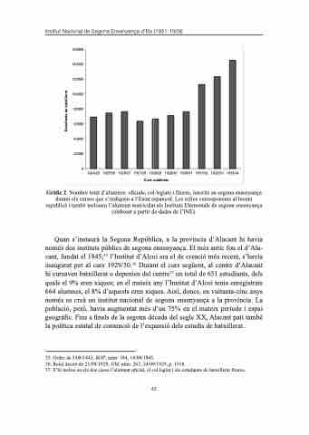Quan s’instaurà la Segona República, a la província d’Alacant hi havia només dos instituts públics de segona ensenyança. El més antic fou el d’Ala- cant, fundat el 1845;35 l’Institut d’Alcoi era el de creació més recent, s’havia inaugurat per al curs 1929/30.36 Durant el curs següent, al centre d’Alacant hi cursaven batxillerat o depenien del centre37 un total de 651 estudiants, dels quals el 9% eren xiques; en el mateix any l’Institut d’Alcoi tenia enregistrats 664 alumnes, el 8% d’aquests eren xiques. Així, doncs, en vuitanta-cinc anys només es creà un institut nacional de segona ensenyança a la província. La població, però, havia augmentat més d’un 75% en el mateix període i espai geogràfic. Fins a finals de la segona dècada del segle XX, Alacant patí també la política estatal de contenció de l’expansió dels estudis de batxillerat.